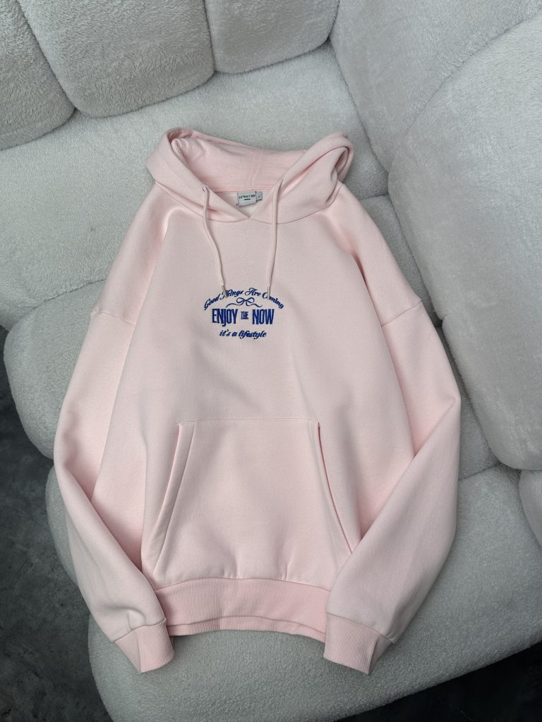 01 آبان هودی زنانه راما قشم کد 3483 هودی کرکدار لش صورتی – مدل «Enjoy the Now» این هودی جذاب با طراحی اسپرت و رنگ صورتی ملایم، انتخابی