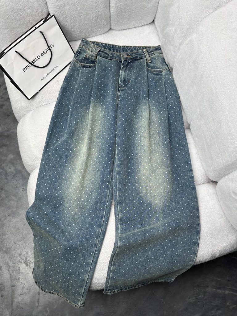 22 مهر شلوار سوپربگ راما قشم کد 3539 یک شلوار جین زنانه با مدل سوپربگ (Super Baggy)، جنس جین و طرح خالدار (Polka Dot) با همان رنگ خاص